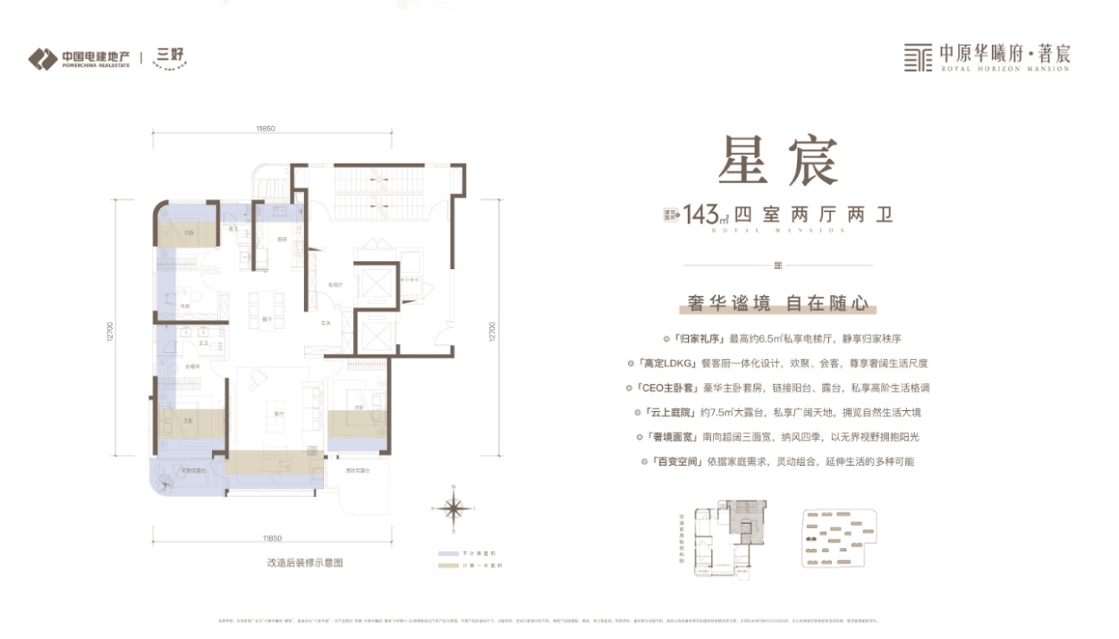 电建华曦府楼盘 120-140㎡三居改善户型,是为追求品质生活的三口之家、四口之家打造的优质产品,空间舒适阔绰,能够满足家庭的高品质生活需求。该户型采用大面宽、短进深的设计,最大限度地增加了室内的采光面积,让每个房间都能享受到充足的阳光。客厅开间达到 4.5 米以上,宽敞明亮,与南向阳台相连,视野开阔,能够将社区内的优美景观尽收眼底。闲暇时,家人围坐客厅聊天品茶,或是邀请朋友小聚畅谈,阔绰空间让每一次相处都倍感从容。